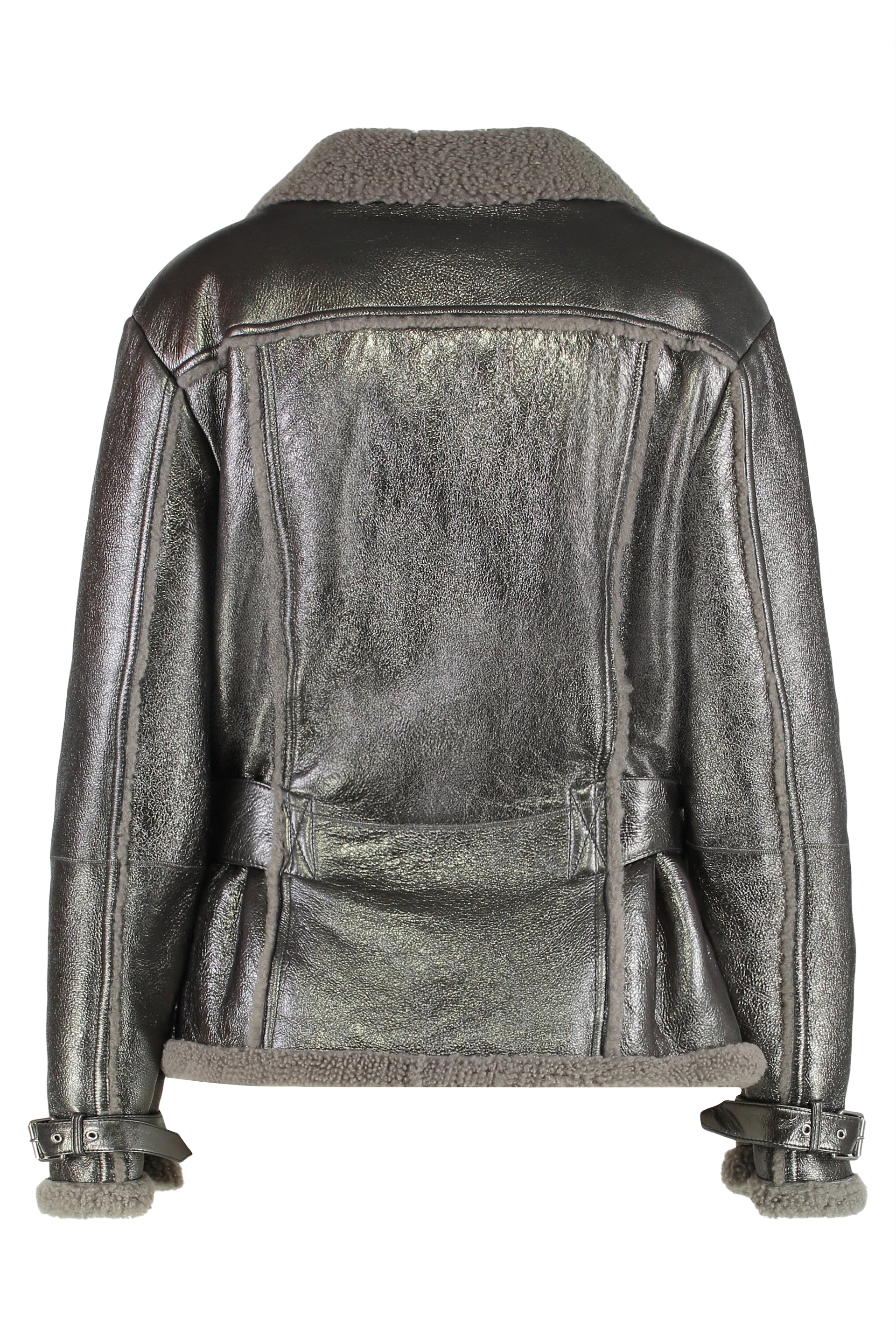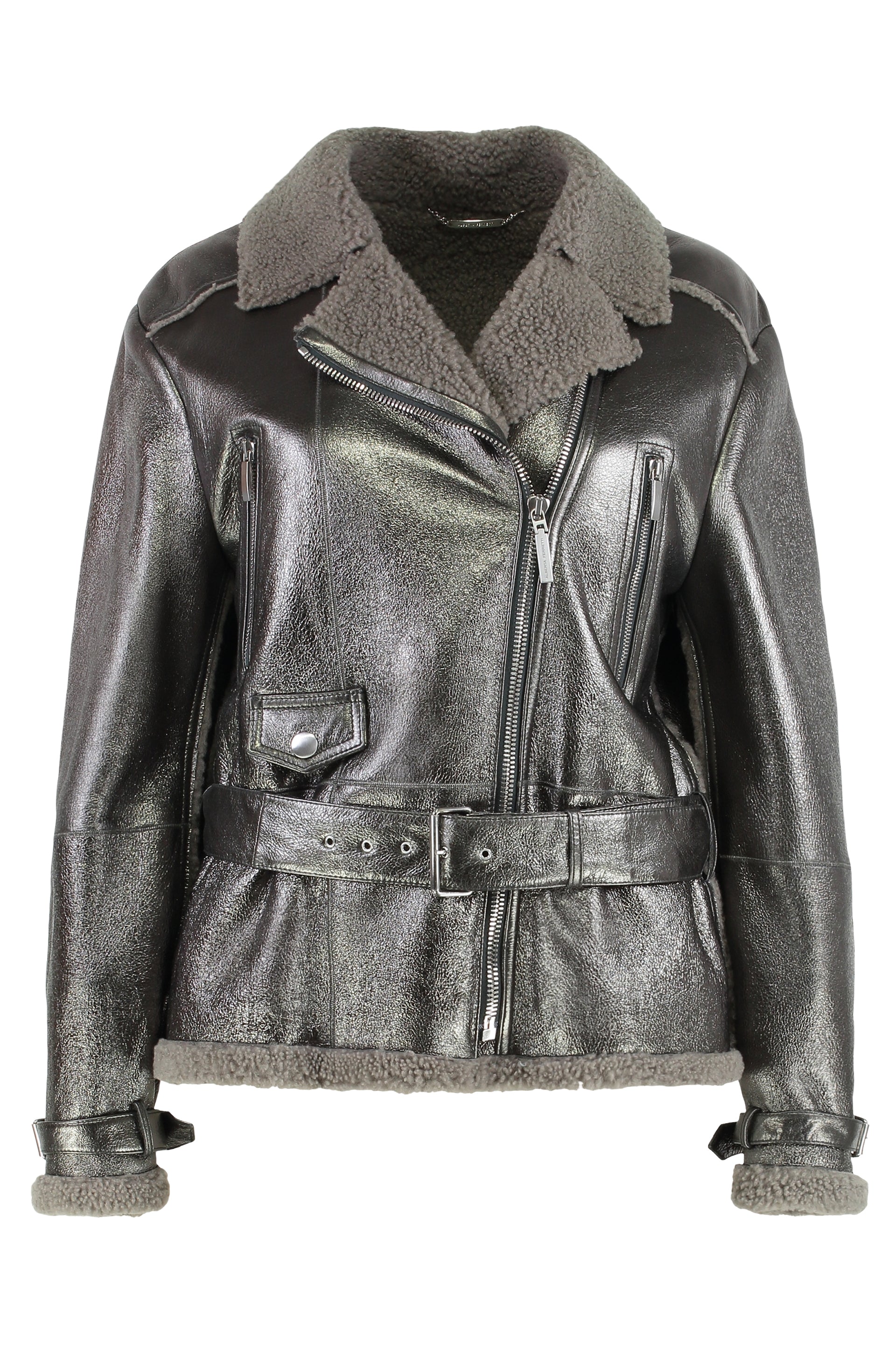 Coat in sheepskin with an elegant and modern design. It features a wide and refined collar, a waist belt for adjustable fit, and practical side pockets. Its shiny finish adds a touch of style, making it ideal for various occasions. Perfect to complete your autumn or winter look.