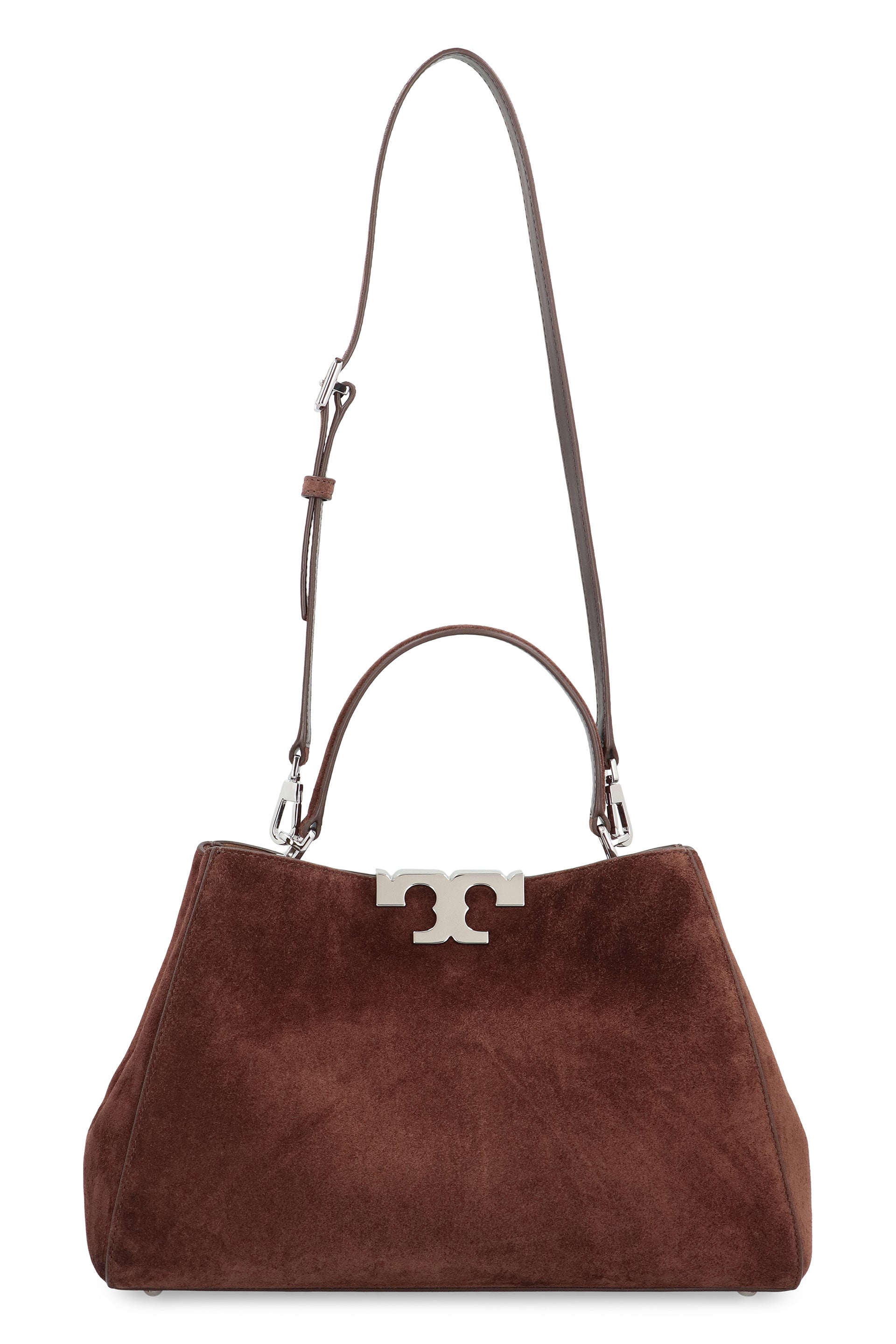 This bag is made of soft suede with leather details. Completely lined in fine suede, the interior is organized with a central divider and a pocket with flap for maximum practicality. The sculptural curves of the iconic double T join the snap magnetic closure. A true masterpiece of artisanal craftsmanship, designed to be comfortably carried by hand with the top handle or over the shoulder thanks to the removable strap. Perfect for organizing your daily essentials, it is a versatile accessory for any outfit.